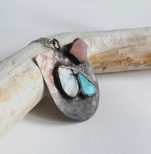 Wisior z kamieniami howlitu,różowego kwarcu i masy perłowej.Patynowana na ciemno miedz.Wymiary wisiorka 7,5x5cm.Łańcuszek w komplecie.