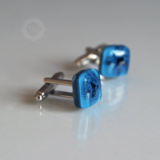Spinki do mankietów ze szklanymi oczkami, wykonanymi ze szkła metodą fusingu.