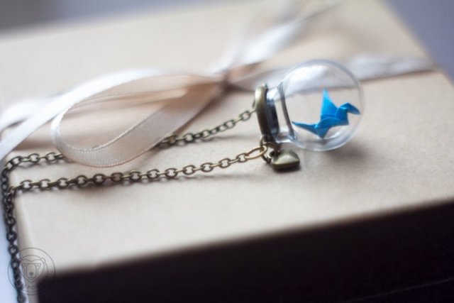 Delikatny, maleńki, papierowy żuraw - japoński symbol szczęścia, zdrowia i pokoju. Podobno, jeśli w jakiejś intencji złoży się tysiąc żurawich figurek, to życzenie się spełni. My spełniamy życzenia tym zjawiskowym wisiorkiem. Papierowy żuraw ukryty w szklanej kuleczce o najszerszej średnicy 2 cm. Część ozdobna zawieszona na łańcuszku o długości 37 cm. Całość w kolorze starego złota/brązu.