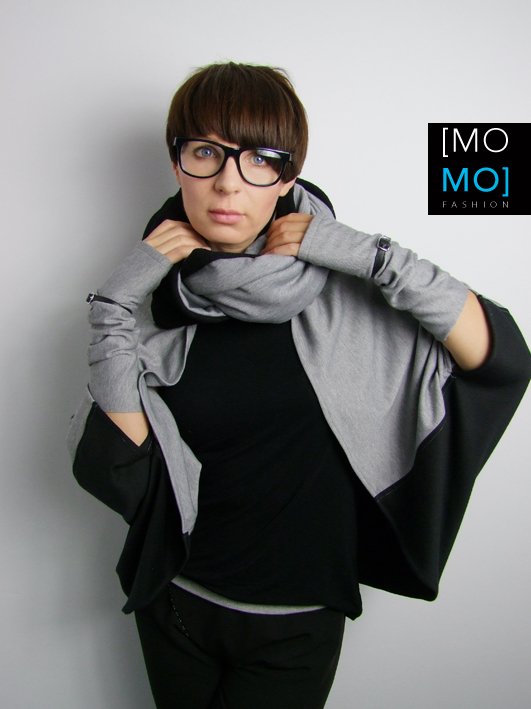 Otulacz ciała z NOWEJ KOLEKCJI LUSA by momo idealny na każda porę roku wykonany z dzianiny, góra szara melanż, dół czarny rozmiar uniwersalny modelka na zdjęciu 170cm rozmiar 36-38 w komplecie dzianinowe rękawiczki z ozdobnym klamrami