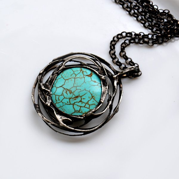 Artystyczny wisior z naturalnym kamieniem w pięknym kolorze.Średnica wisiora to ok. 4,5 cm. Kamień oprawiony w miedź pokrytą ekologiczną cyną stylizowaną na stare srebro, zawieszony na długim łańcuchu. Biżuteria w 100% wykonana ręcznie, poszczególne sztuki mogą się minimalnie różnić.
