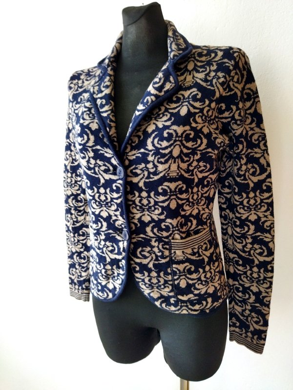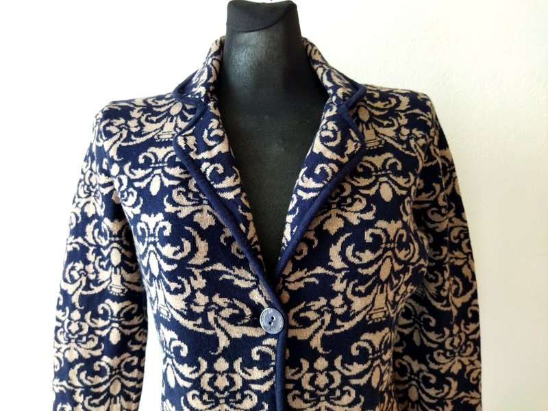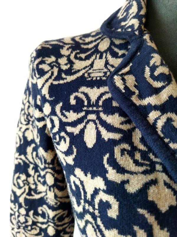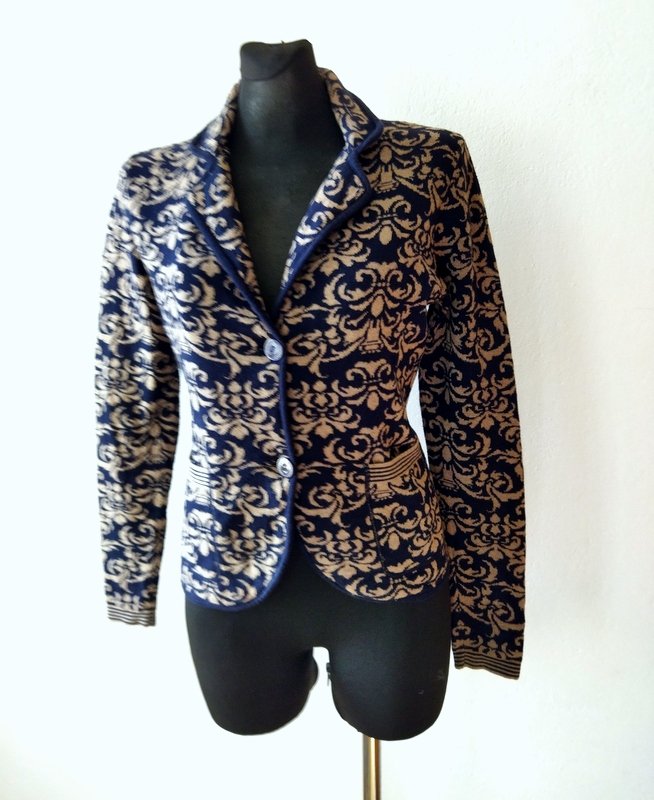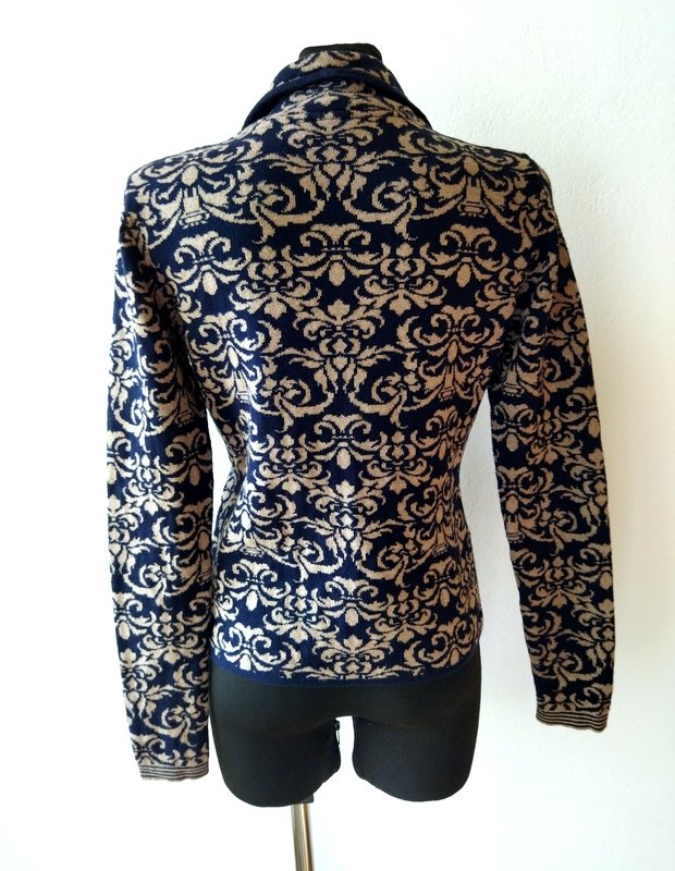 Sweter lub dzianinowy żakiet w beżowe ornamentowe wzory na ciemnogranatowym prawie czarnym tle. Z kołnierzem z rewersami, z dwiema naszywanymi kieszeniami. zapinany na guziki.