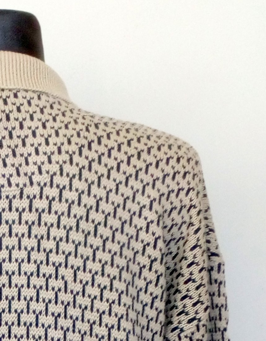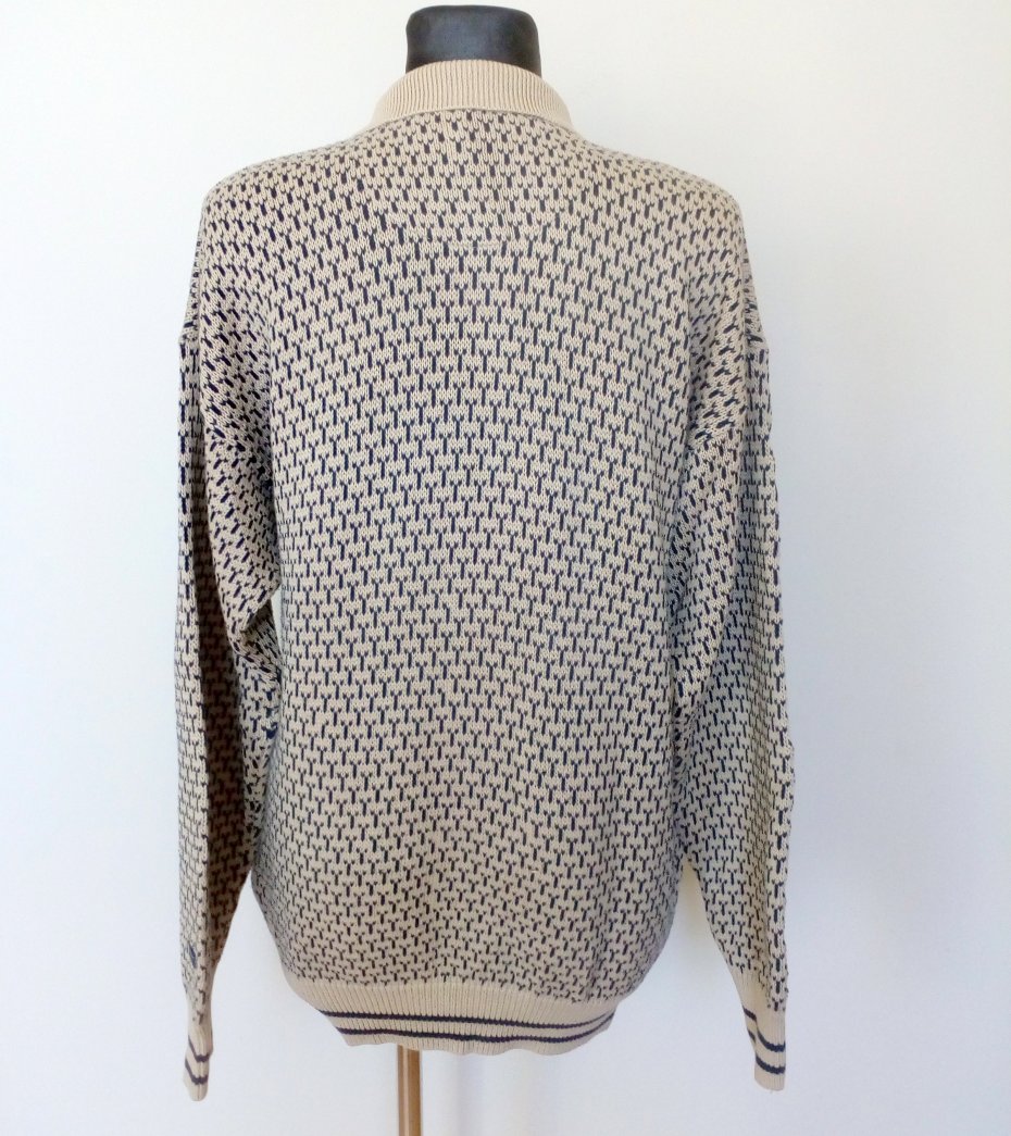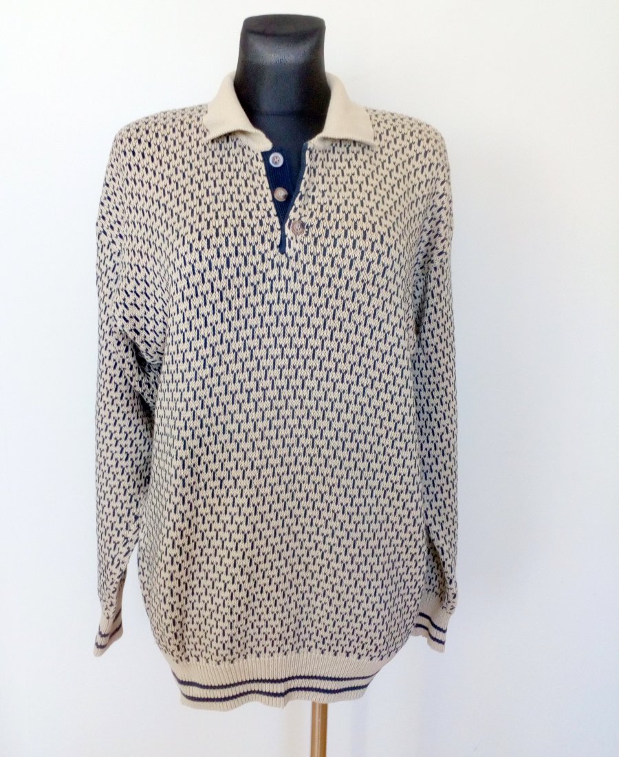 Ciepły, męski sweter w kolorze ciemnego beżu i granatu, rękawy obniżane, ściągacz u dołu i przy rękawach