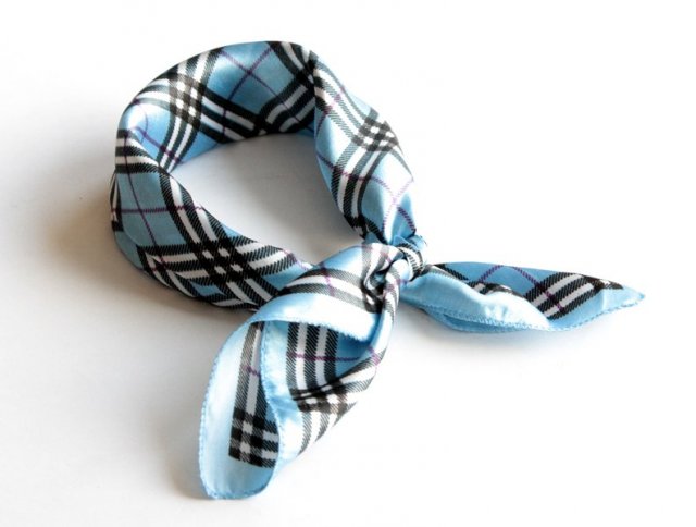Niewielka chusta w odcieniach błękitu w ponadczasowy wzór - kratkę w stylu Burberry.