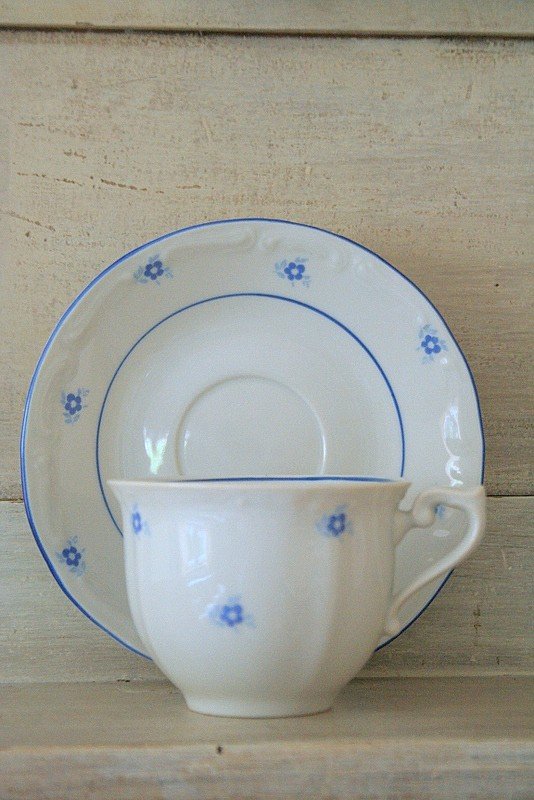 Uroczy porcelanowy zestaw...talerzyk z filiżanką...z uroczymi niebieskimi kwiatuszkami.