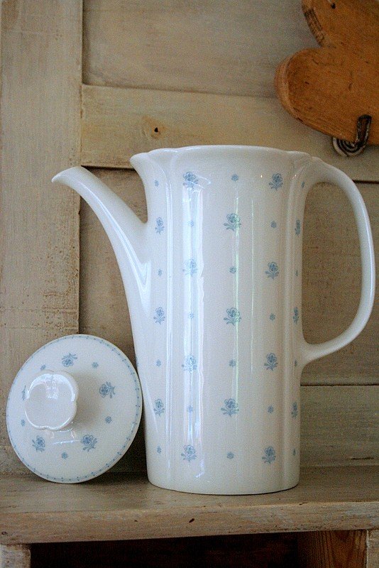 Uroczy biały porcelanowy dzbanek. Ozdobiony motywem drobnych niebieskich kwiatuszków:) Porcelana niemiecka - stary Arzberg.