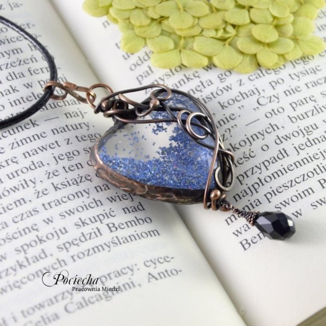 Wisior stanowi połączenie miedzi jubilerskiej, ekologicznej cyny ( bez ołowiu ! ) ze szkłem wewnątrz którego zamknęłam brokat pamiętający czasy PRL-u !!! Brokat jest wewnątrz ruchomy.