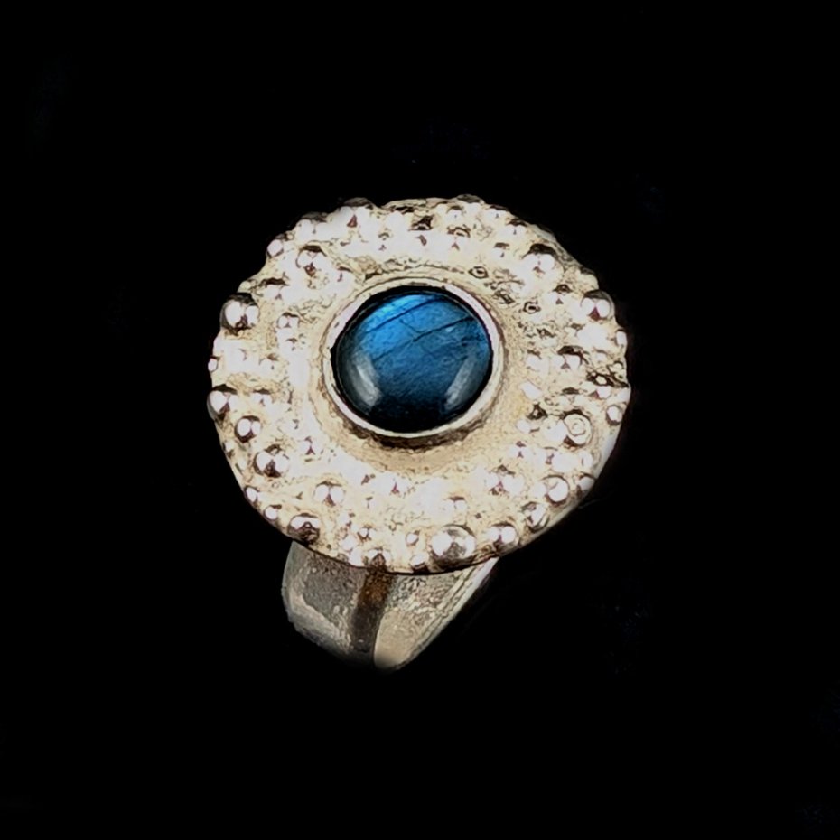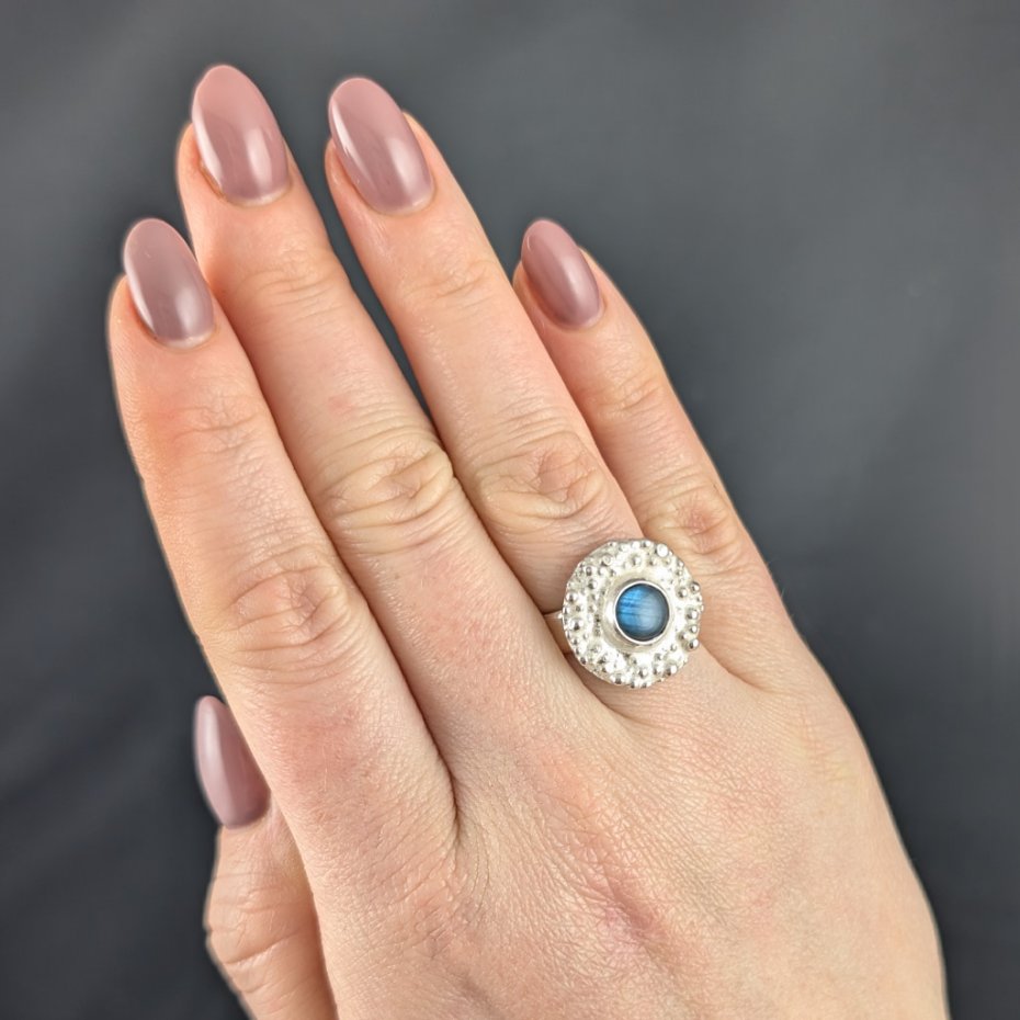 Pierścień wykonany ze srebra próby 925. Rozmiar pierścionka dzięki otwartej podstawie regulowany, proszę napisać, dopasuję po zakupie. Ozdobą pierścionka jest labradoryt. Średnica elementu 20 mm. Waga 7 g, rozmiar jubilerski mogę dopasować w szerokim zakresie, jest regulowany proszę napisać na jaki. Pierścień wyslany zostanie w ozdobnym pudełeczku.