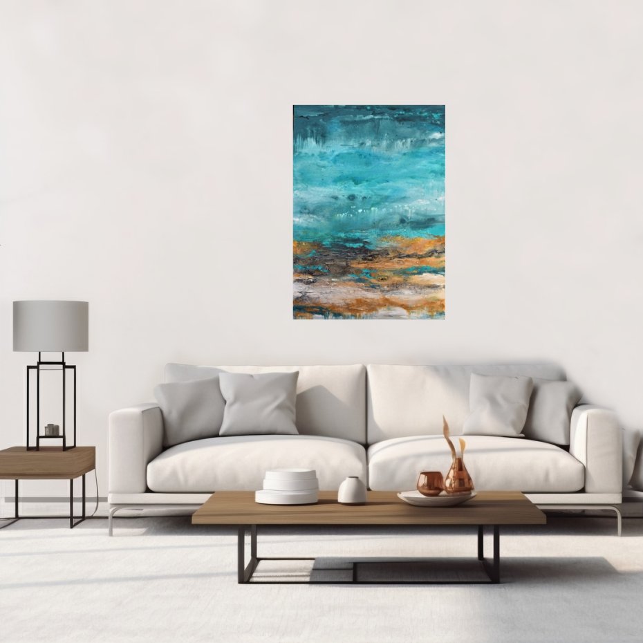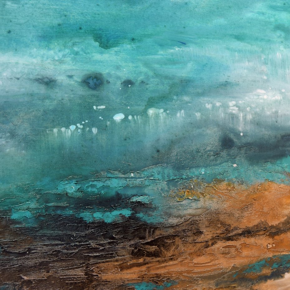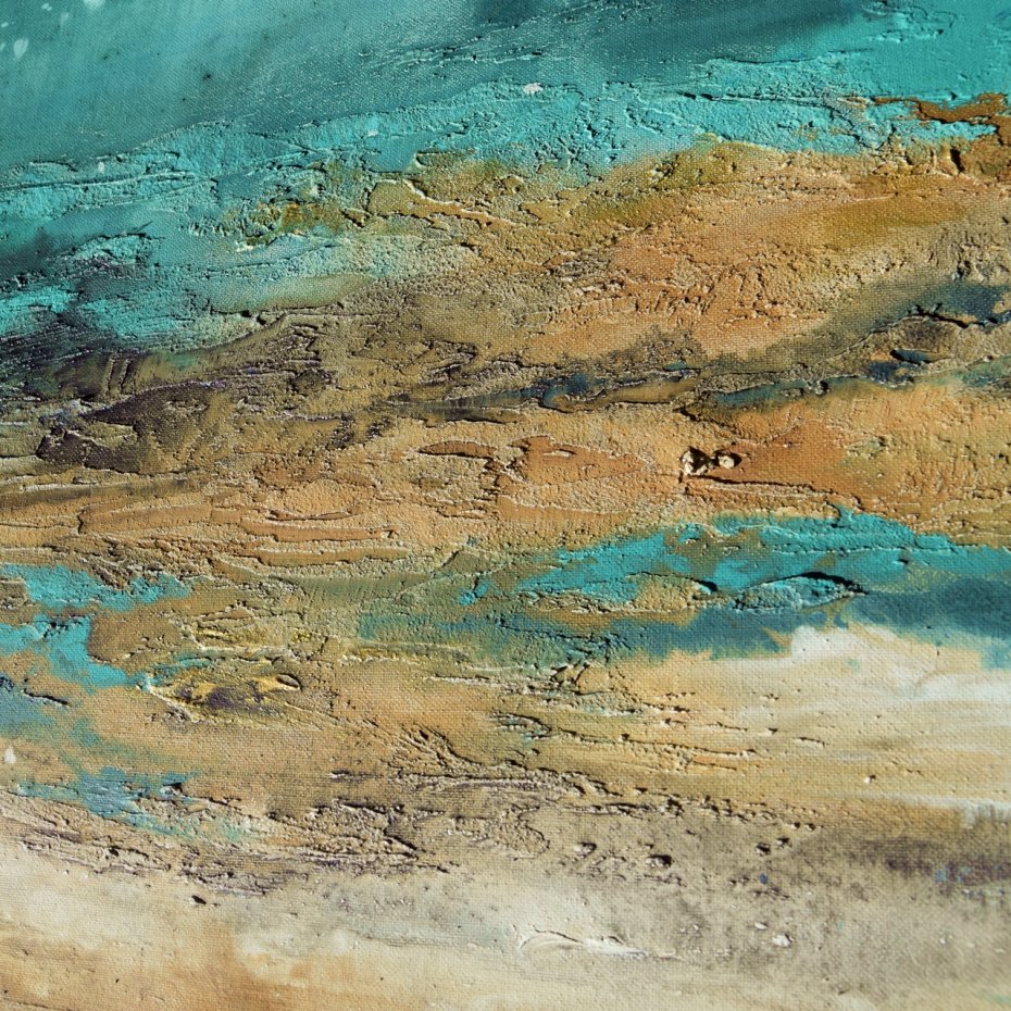 Obraz malowany w technice akrylowej, częściowo w technice pouringu, z grubą, wyraźną strukturą, na płótnie naciągniętym na blejtram (drewnianą ramę) o grubości ok. 2 cm.