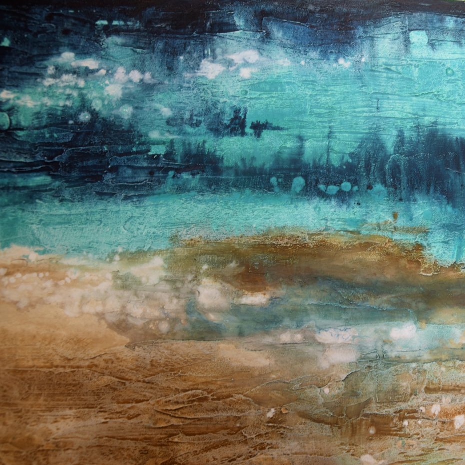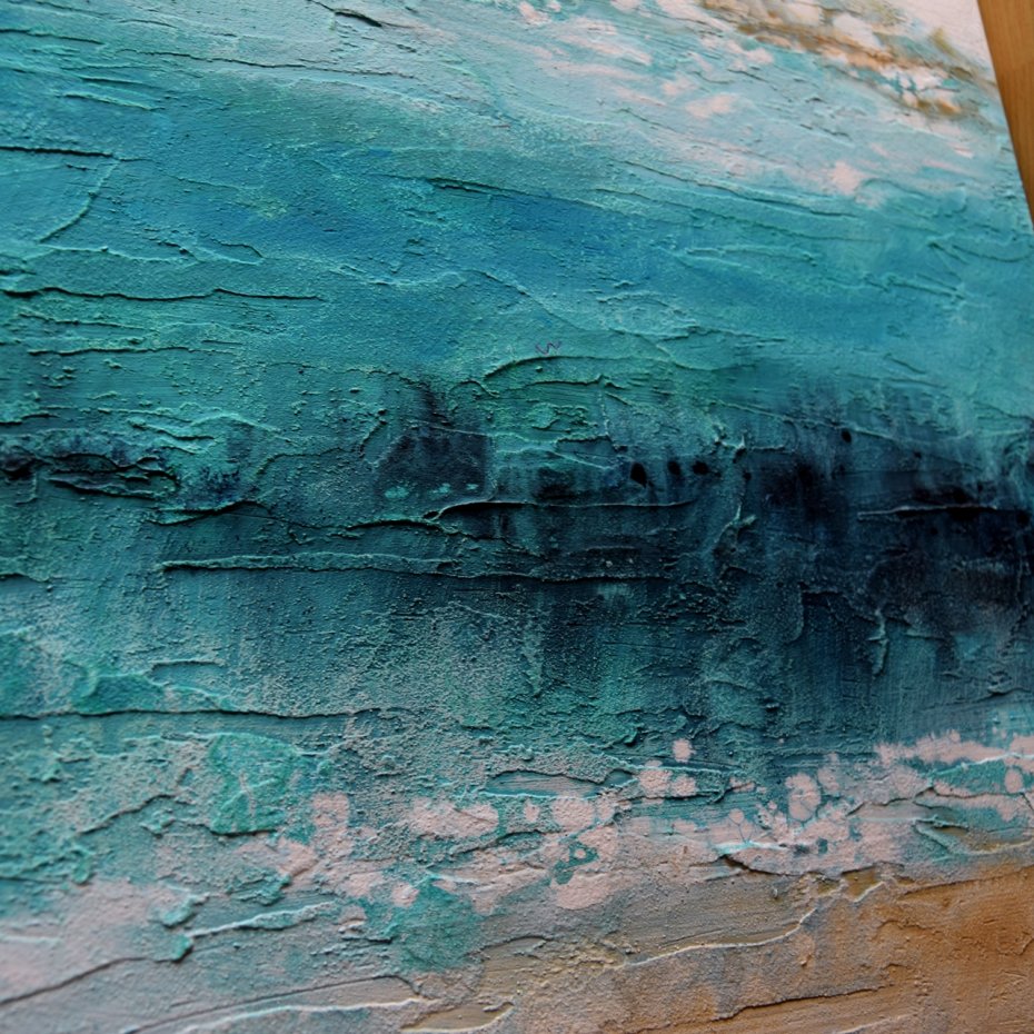 Obraz malowany w technice akrylowej, częściowo w technice pouringu, z grubą, wyraźną strukturą, na płótnie naciągniętym na blejtram (drewnianą ramę) o grubości ok. 2 cm.