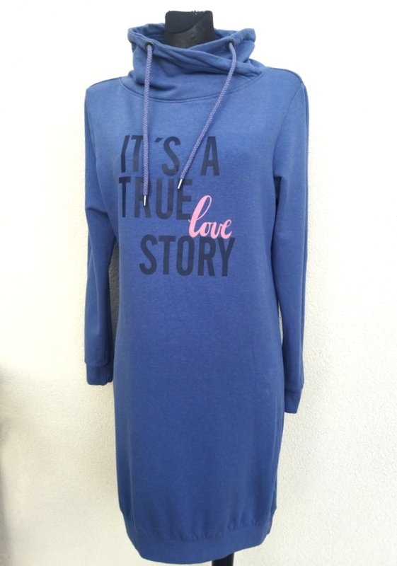 Miła sukienka z miękkiej dresowej tkaniny bawełniano-wiskozowej w zgaszonym niebieskim kolorze, z napisami z przodu. Z kołnierzem a' la golf ściąganym troczkami, wykończona ściagaczami.