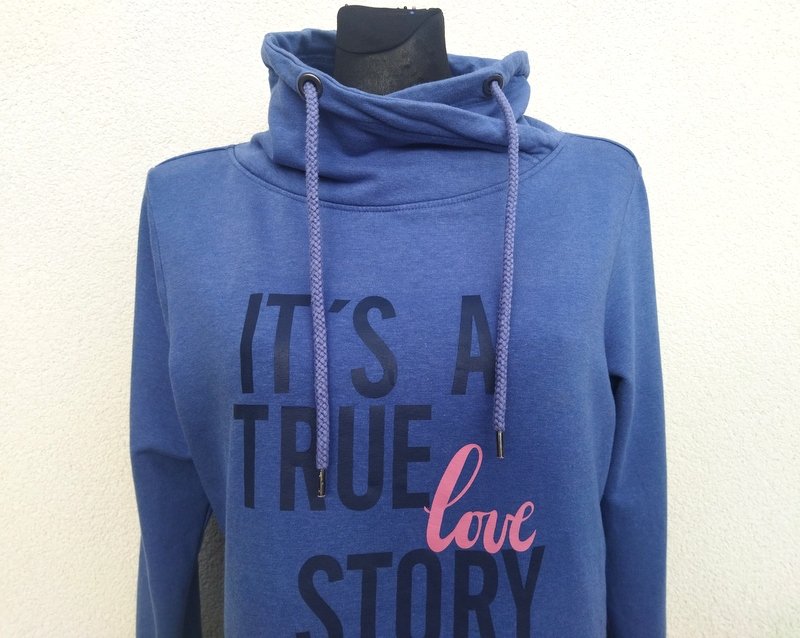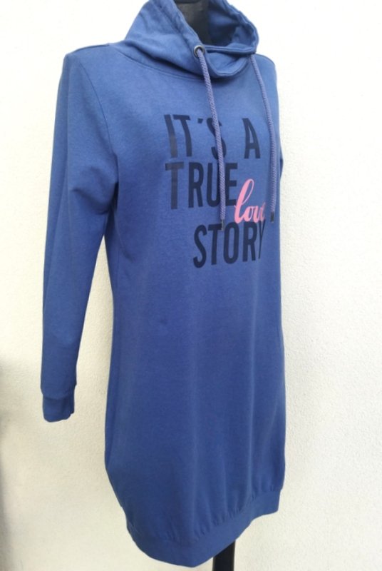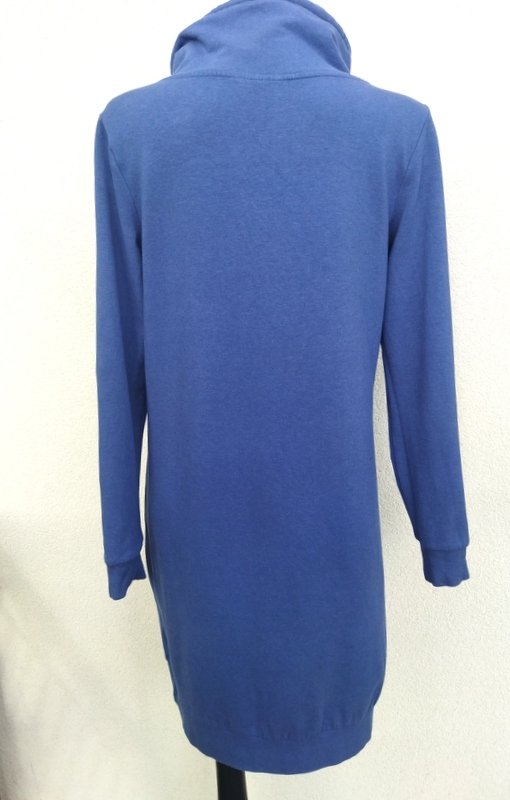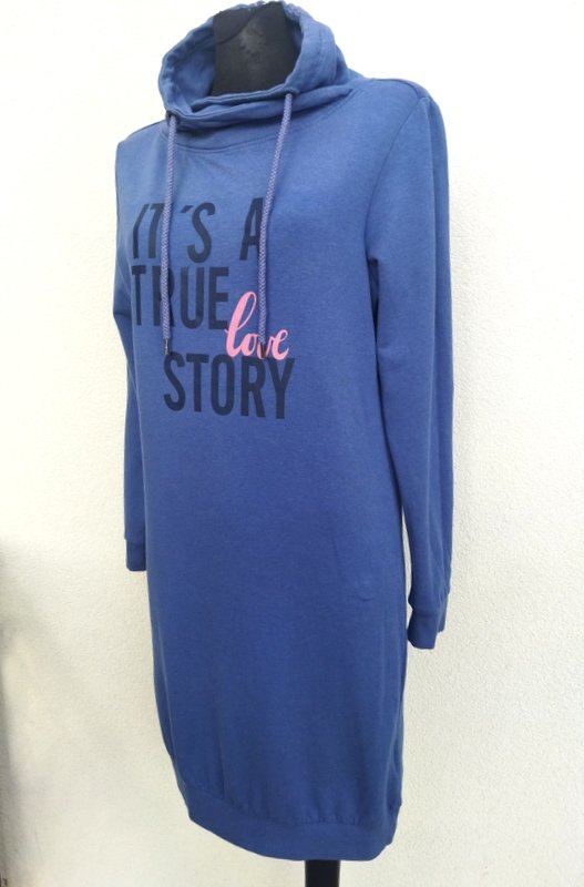 Miła sukienka z miękkiej dresowej tkaniny bawełniano-wiskozowej w zgaszonym niebieskim kolorze, z napisami z przodu. Z kołnierzem a' la golf ściąganym troczkami, wykończona ściagaczami.