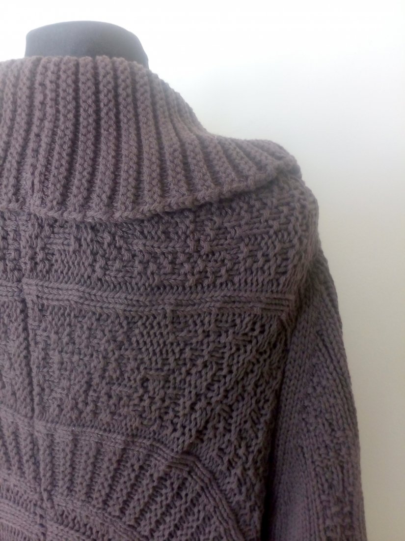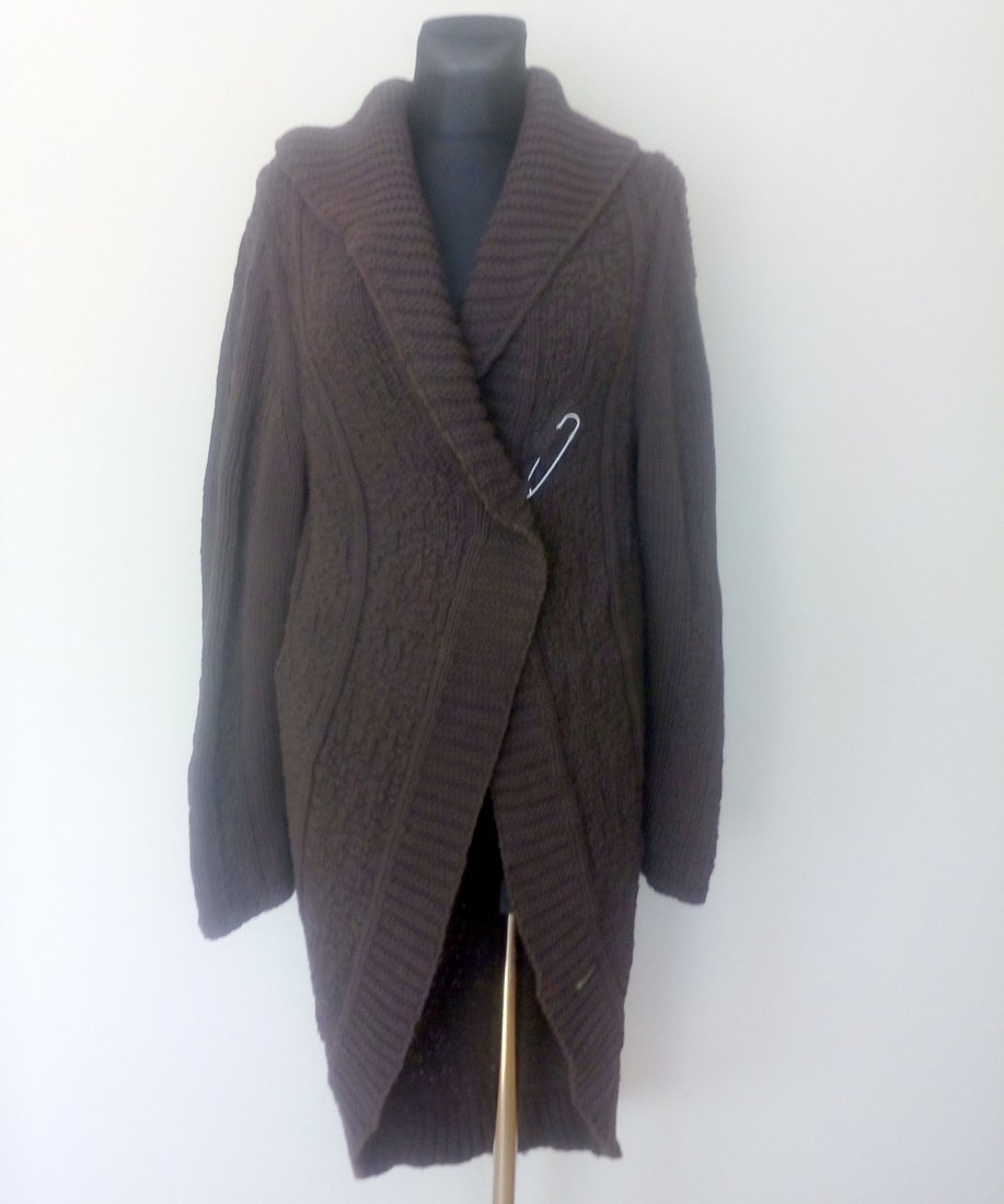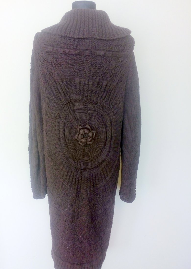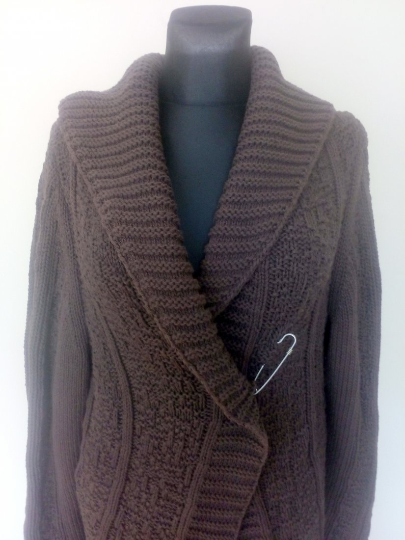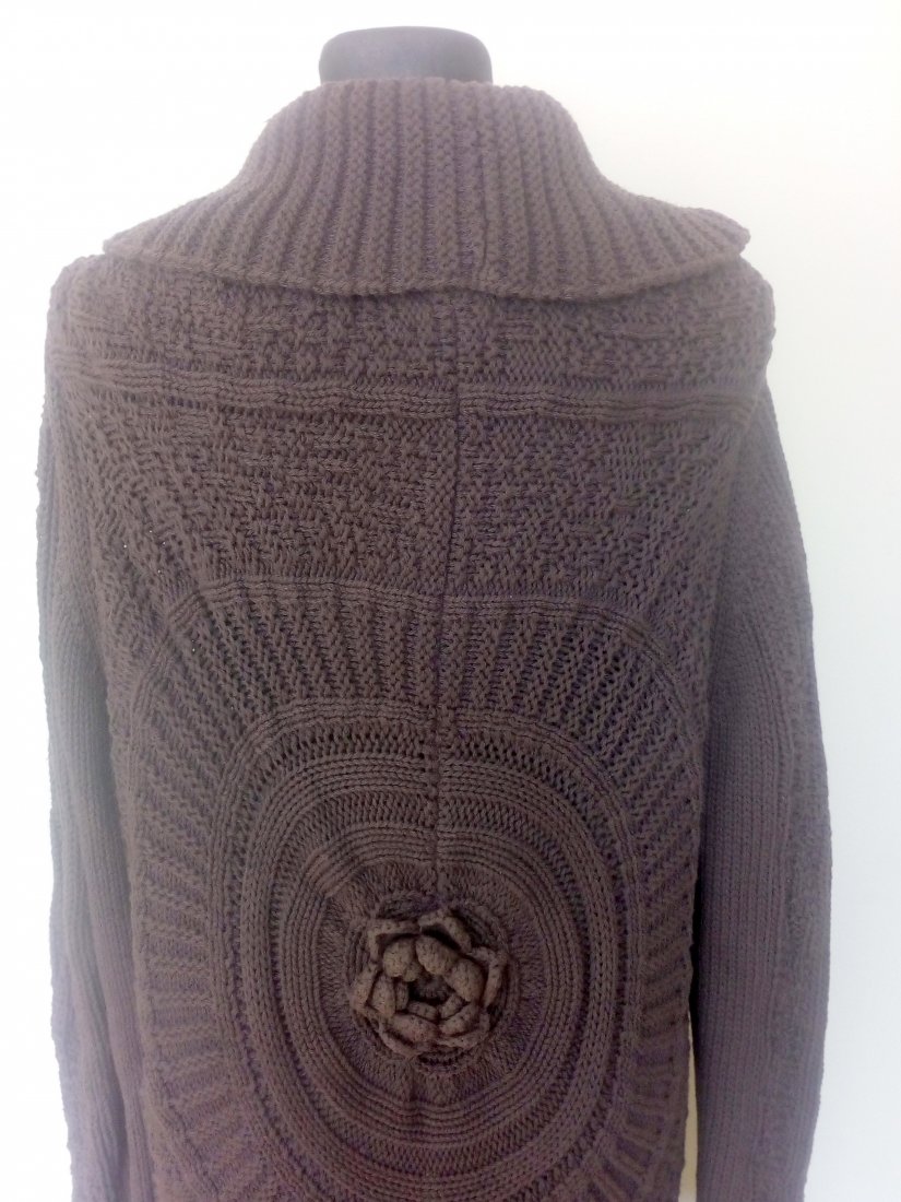 Długi sweter w czekoladowym kolorze, o półokrągłym kroju, z szalowym kołnierzem, wiązany od środka trokami, po górze zapinany dużą agrafką, rękaw obniżany, na plecach ładny rozetowy wzór