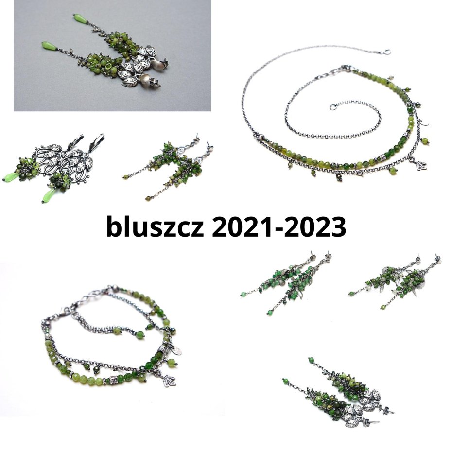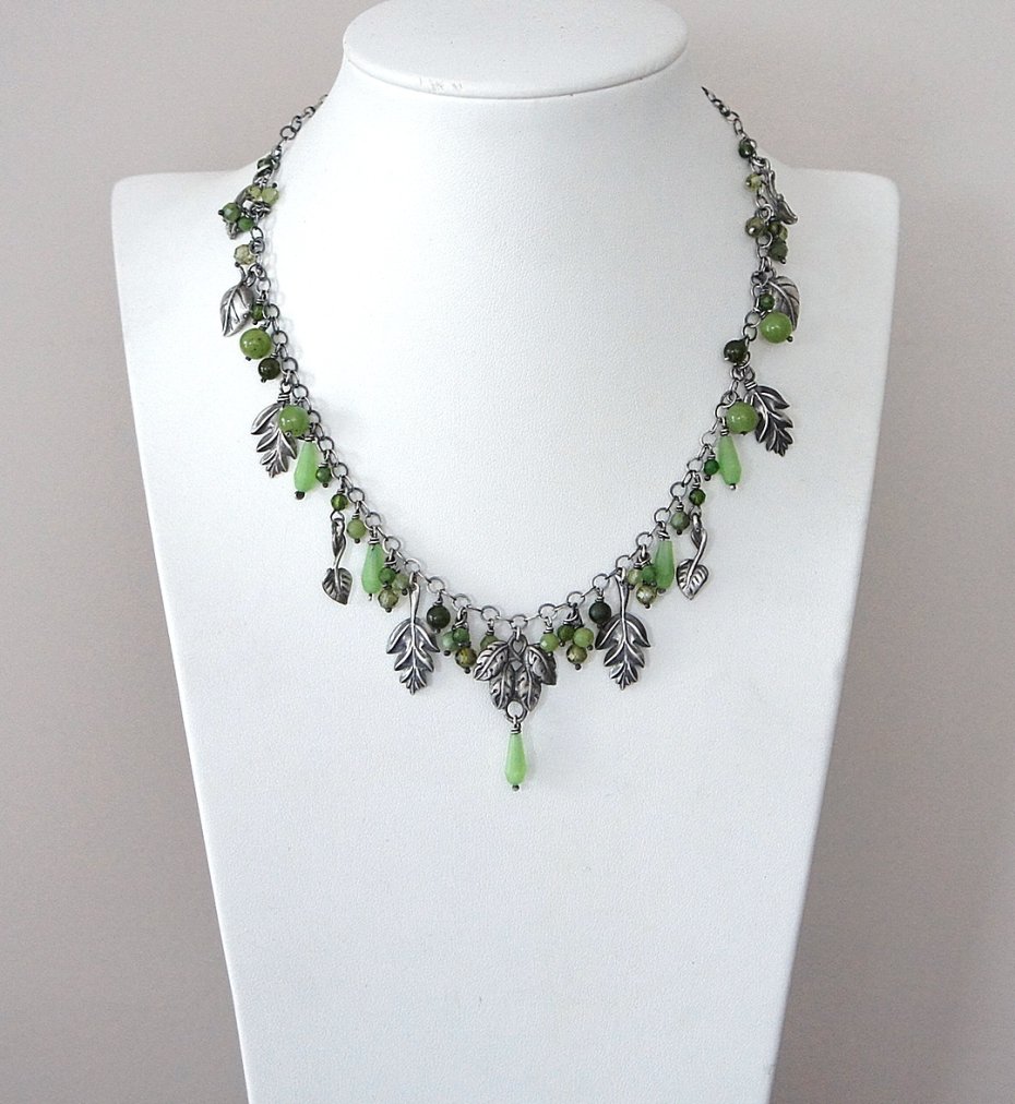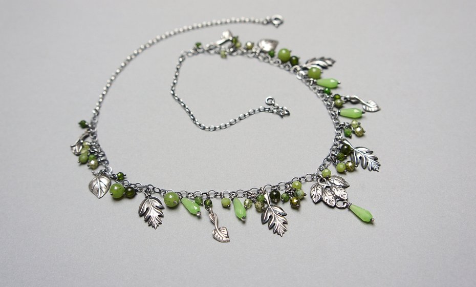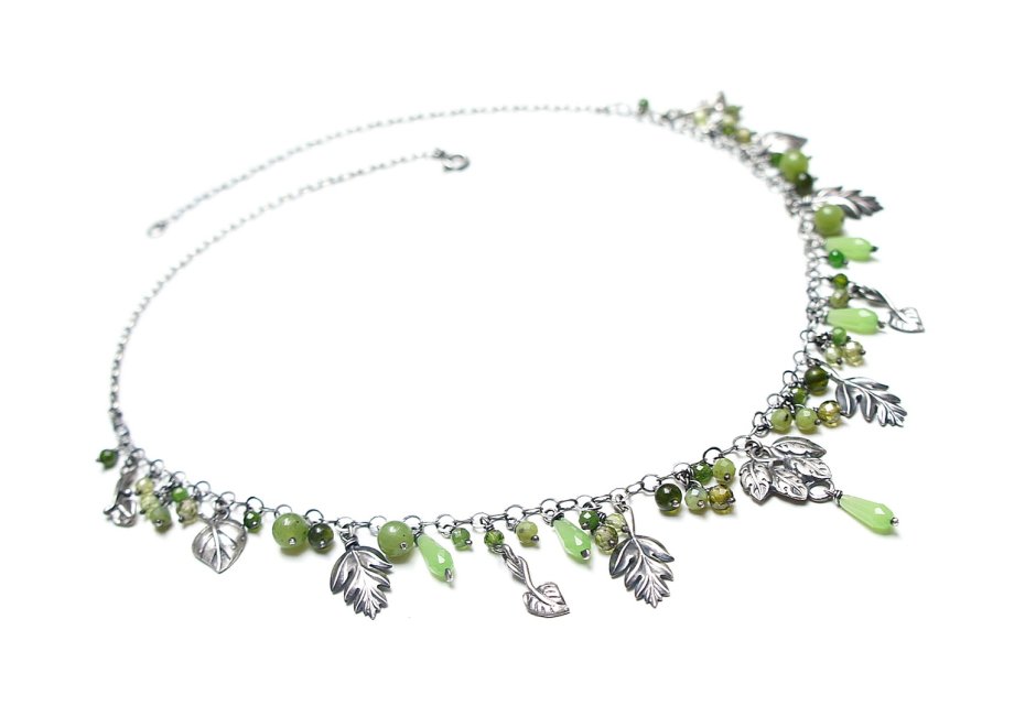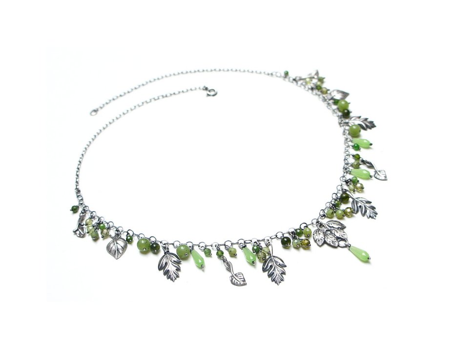Krótki naszyjnik wykonany ze srebra [pr. 925] w połączeniu z kuleczkami nefrytów [6mm], fasetowanymi diopsydami [3mm] ,nefrytami [4mm], kuleczkami marmuru [4mm], cyrkoniami [4mm],fasetowanymi peridotami [3mm] , kryształkami [10mm] oraz srebrnymi listkami. Srebro oksydowane i przetarte. Całkowita długość naszyjnika około 49 cm. Biżuteria ozdobnie zapakowana.
