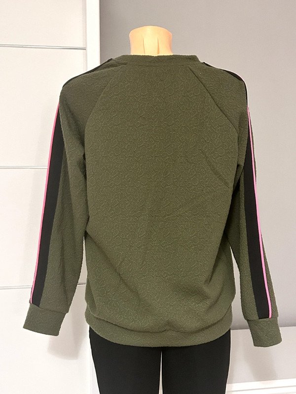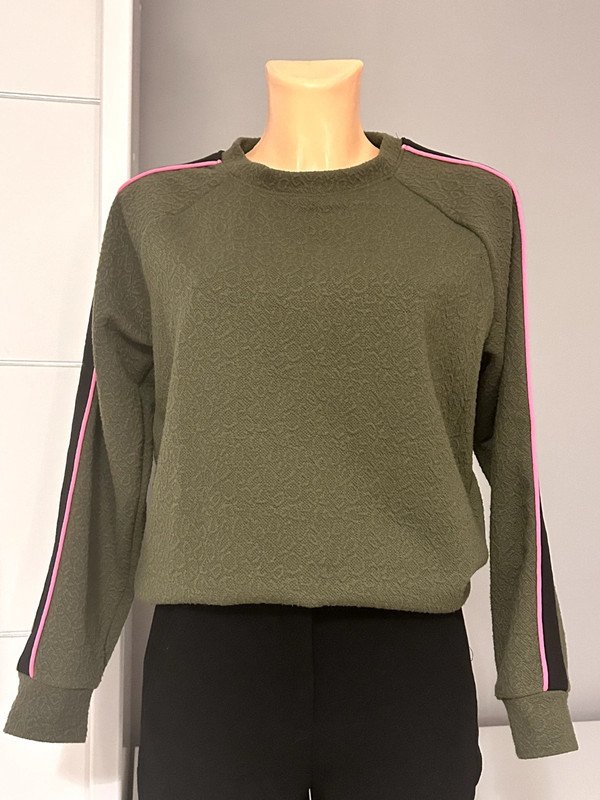 Bluza damska firmy VRS Woman rozmiar S 36. Kolor khaki zielony. Na rękawach czarno-różowy lampas.