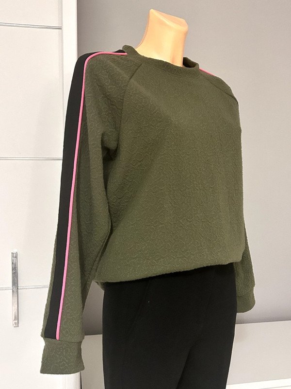 Bluza damska firmy VRS Woman rozmiar S 36. Kolor khaki zielony. Na rękawach czarno-różowy lampas.