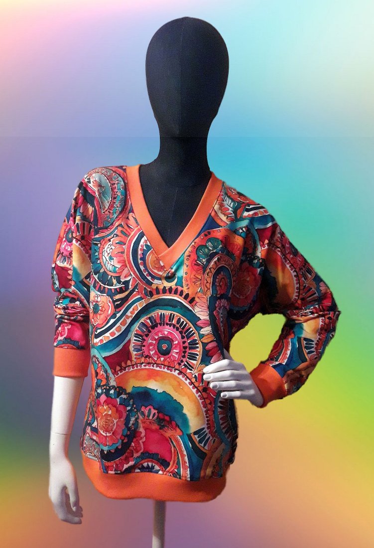 Dekolt, dół i rękawy wykończone pomarańczowym ściągaczem