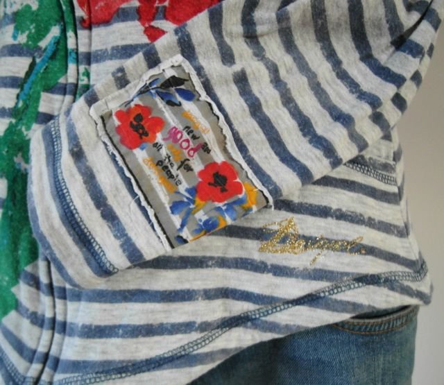 Fajny , asymetryczny krój, boki troszkę krótsze niż przód i tył. Kolor jasno szary , niebieskie paski i soczysta czerwień z zielenią i parę cekinów. Na rękawie kolorowa naszywka.