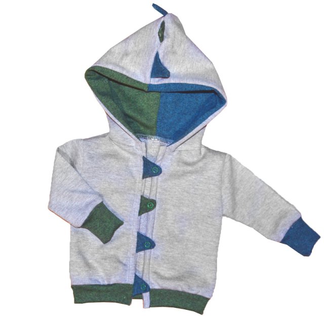 Bluza z kapturem dla malucha wykonana została z dzianiny dresowej w kolorze szarym oraz zielonym i niebieskim.