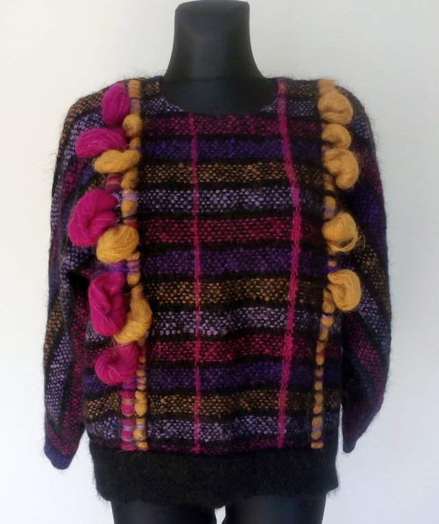 Artystyczna bluza/sweter, dekolt okrągły, rękaw typu nietoperz, doszywane ściągacze przy rękawach i u dołu bluzy