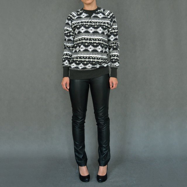 Bluza marki H&M w etniczne wzory. W kolorach bieli i grafitu. Rękawy i dół wykończone ściągaczem. Polecam.