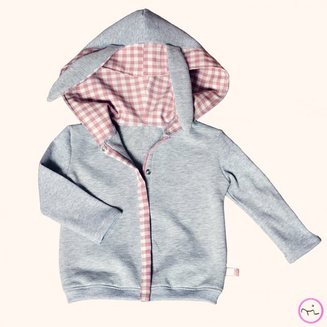 Bluza z kapturem dla malucha wykonana została z dzianiny dresowej w kolorze szarym oraz z pięknej bawełny w różową kratkę. Bluza zapinana na zatrzaski, wykończona szarym ściągaczem.