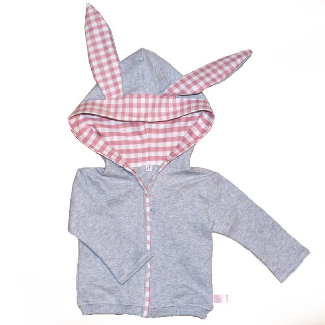 Bluza z kapturem dla malucha wykonana została z dzianiny dresowej w kolorze szarym oraz z pięknej bawełny w różową kratkę. Bluza zapinana na zatrzaski, wykończona szarym ściągaczem.