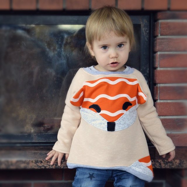 Bluza dla malucha wykonana została z grubej dzianiny dresowej w kolorze pastelowym pomarańczowym. Lisek z pomarańczowej dresówki z nadrukiem oraz elementy z szarej dresówki i czarnej pianki. Bluza wykończona ściągaczem.