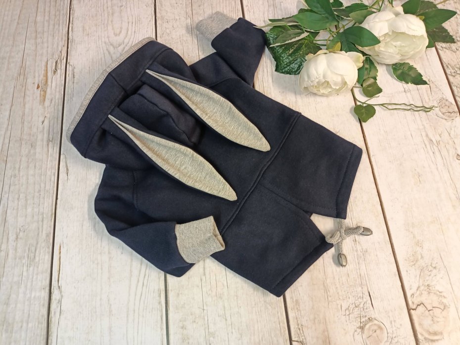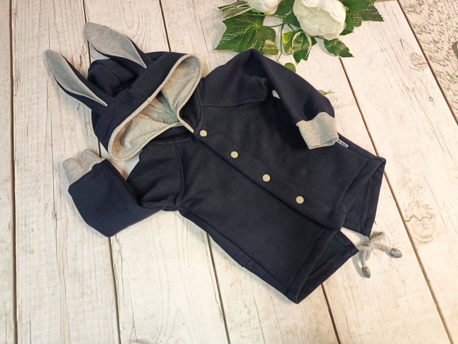 Ocieplana bluza chłopięca z kapturem i podłużnymi uszami, z dresówki drapanej w kolorze granatowym, zapinana na napy na prawą stronę.