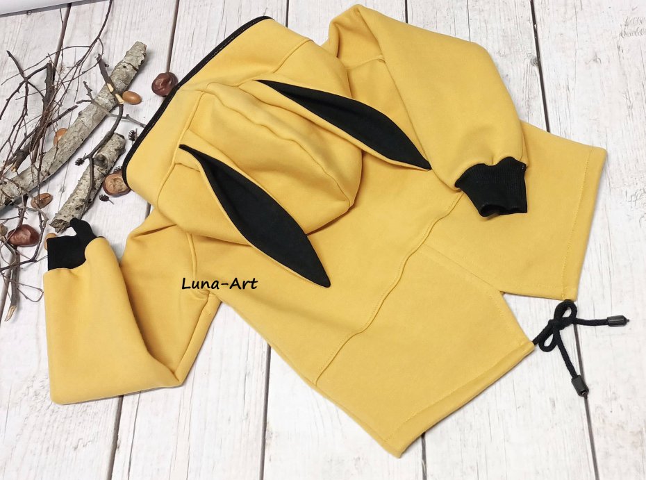 Bluza dziecięca z kapturem i podłużnymi uszami, z dresówki drapanej w kolorze musztardowym, model chłopięcy zapinany na prawą stronę na napy.