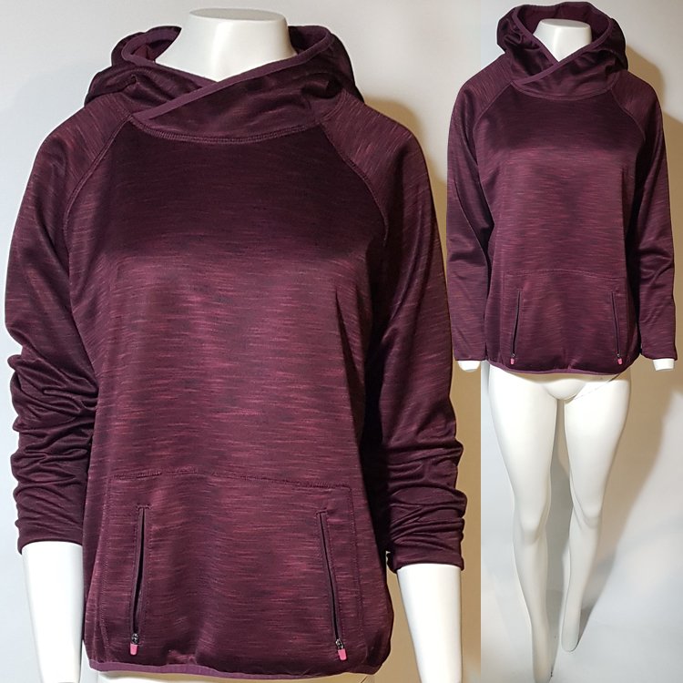 Ciepła bluza sportowa z kapturem i kieszenią typu kangur zapinaną na zamki. Kolor burgund, wzór melanż, od spodu wykończona meszkiem. Dekolt i kaptur oraz dolny brzeg obszyte gumowaną lamówką.