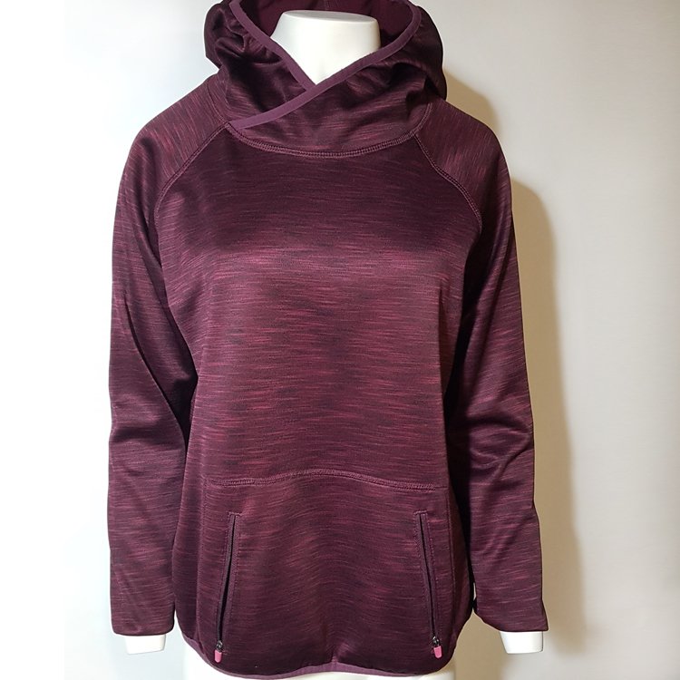 Ciepła bluza sportowa z kapturem i kieszenią typu kangur zapinaną na zamki. Kolor burgund, wzór melanż, od spodu wykończona meszkiem. Dekolt i kaptur oraz dolny brzeg obszyte gumowaną lamówką.
