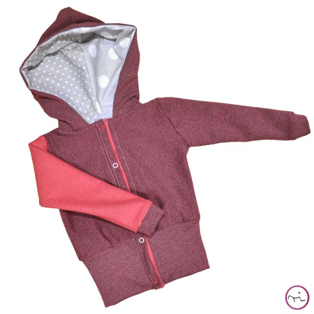 Bluza z kapturem dla malucha wykonana została z dwustronnej dzianiny dresowej w kolorze melanż łososiowy (Bawełna 96%, Elastan 4%) oraz z pięknej bawełny w kropki. Bluza zapinana na zatrzaski, wykończona ściągaczem.