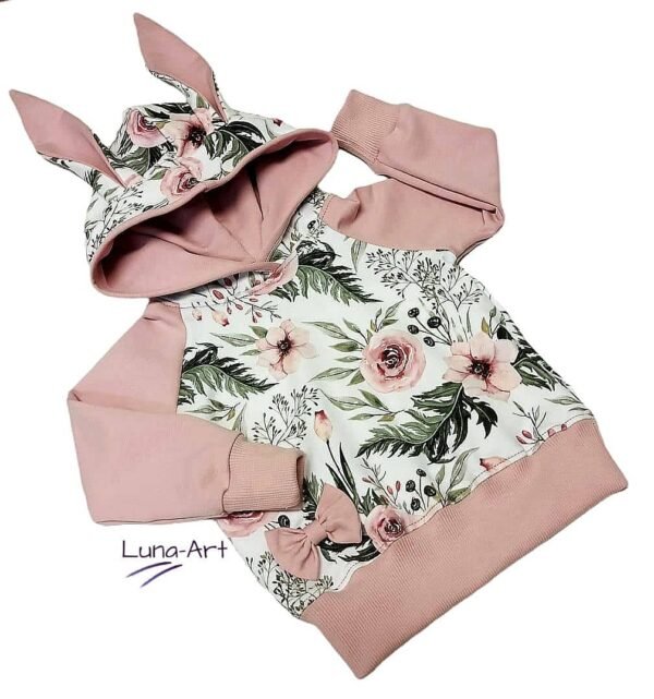 Bluza dziecięca z dresówki pętelki, z kapturem, wzór cyfrowy w urocze kwiaty połączony z dresówką jednolitą w kolorze brudnego różu.