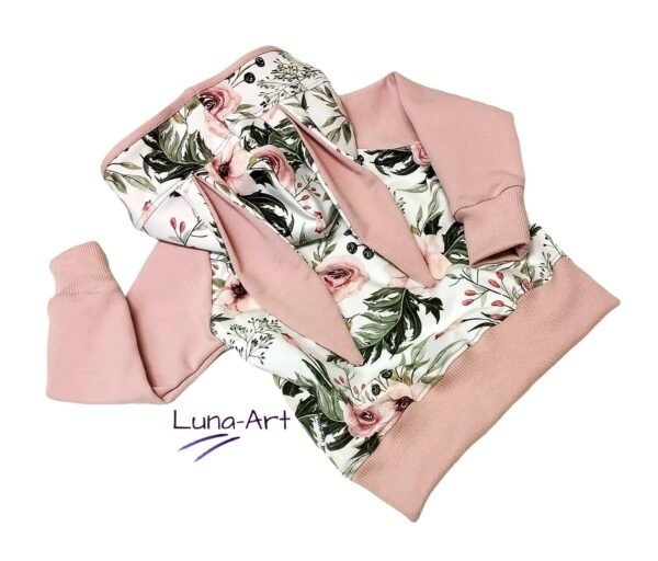 Bluza dziecięca z dresówki pętelki, z kapturem, wzór cyfrowy w urocze kwiaty połączony z dresówką jednolitą w kolorze brudnego różu.