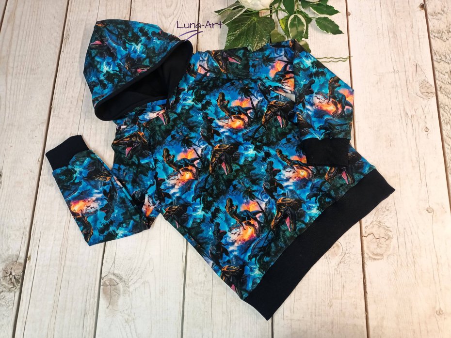 Bluza dziecięca z dresówki pętelki, z kapturem, wzór cyfrowy w dinozaury połączony z dresówką jednolitą w kolorze czarnym.