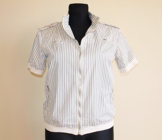 Bluza w biało szare paseczki z krótkim rękawem, zapinana na zamek. Wykończona dzianinowymi ściągaczami. Brak metki ze składem, wygląda jak sztywniejsza bawełna, może z domieszką. Ładne metalowe ozdobniki. Stan bardzo dobry. Rozmiar z metki S. Podaję wymiary mierzone na płasko;