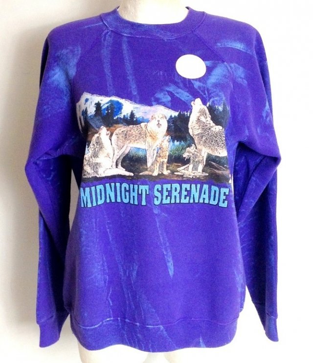 Oldskulowa fioletowa bluzka z wypukłym printem wyjących wilków w górach , faktura materiału kolorystycznie punktowo fabrycznie przecierana, ciepła i stylowa ale nie sprawiająca wrażenia obszernej.