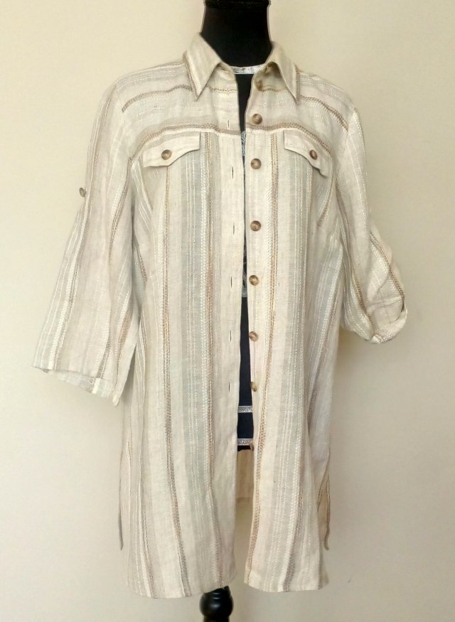 Koszulowa bluzka z przewagą lnu, z przodu karczek, pod nim patki imitujące kieszonki, rękaw 3/4, podpinany paskiem od środka, boki bluzki rozcięte, materiał haftowany w pionowe paski, zapasowy guzik od środka