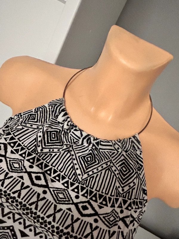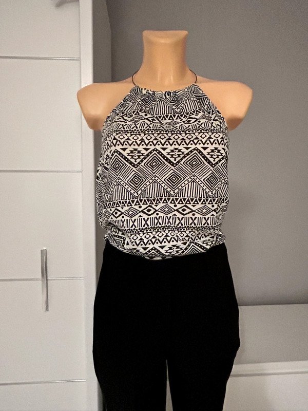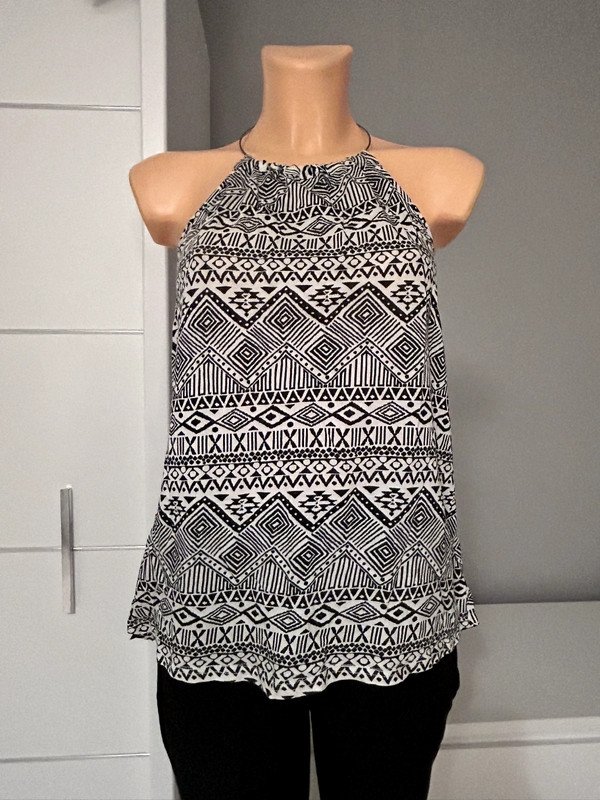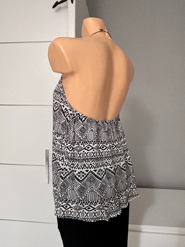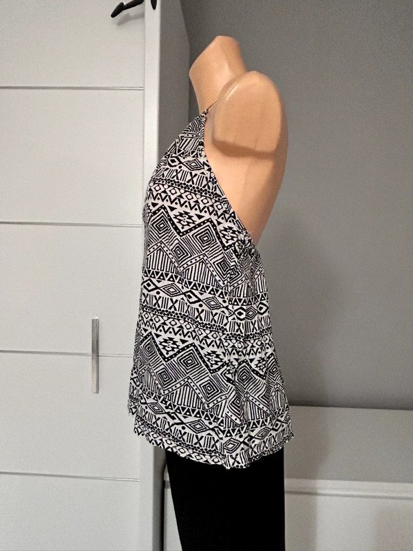 Bluzka Atmosphere rozmiar 40 L, kolor biało czarny we wzorek. Odkryte plecy, metalowa obróżka. Wykonana z wiskozy 100%