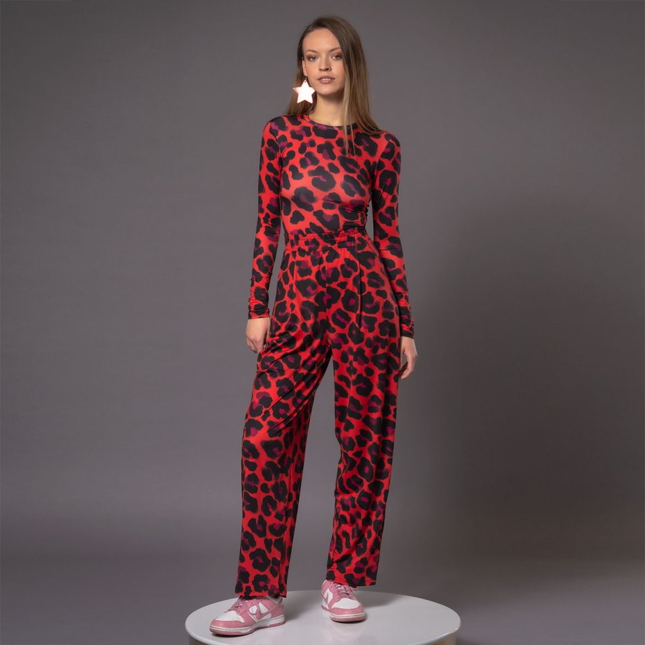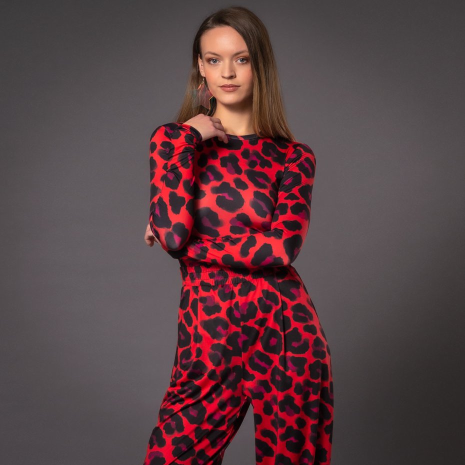 Uszyta z miękkiego, elastycznego jerseyu z autorskim printem Solar Tropic, łączy wygodę z mocnym kolorem i charakterem. Ma dopasowany krój, długi rękaw i zabudowany, okrągły dekolt, dzięki czemu pięknie podkreśla sylwetkę i stanowi świetną bazę pod wiele stylizacji.