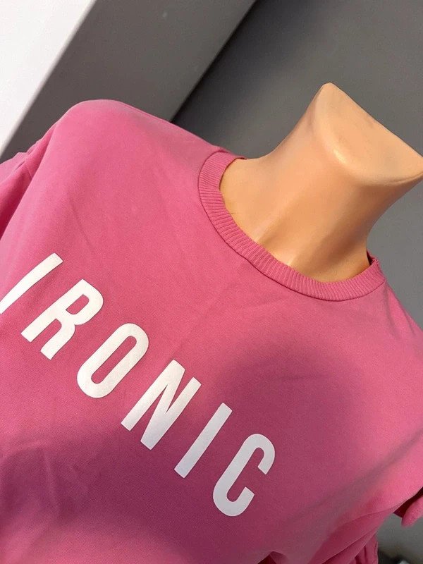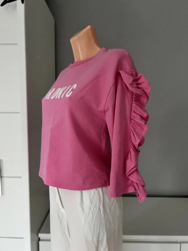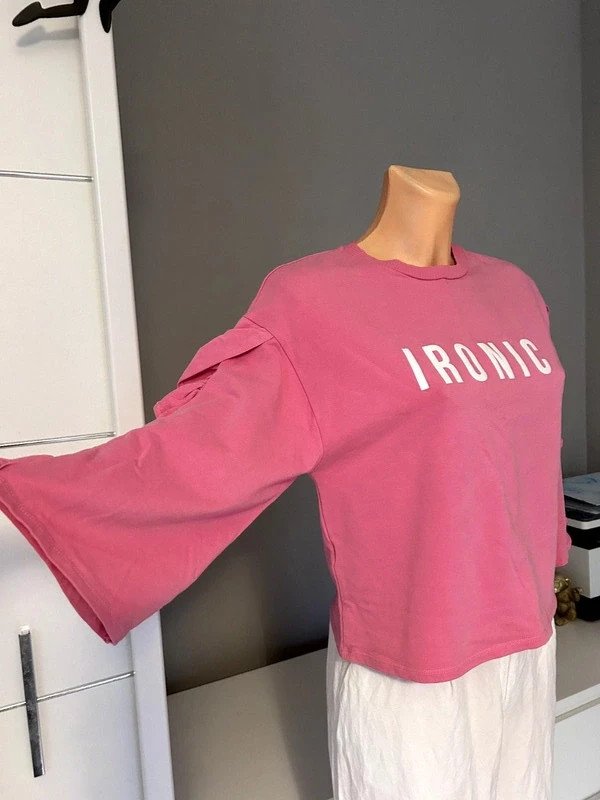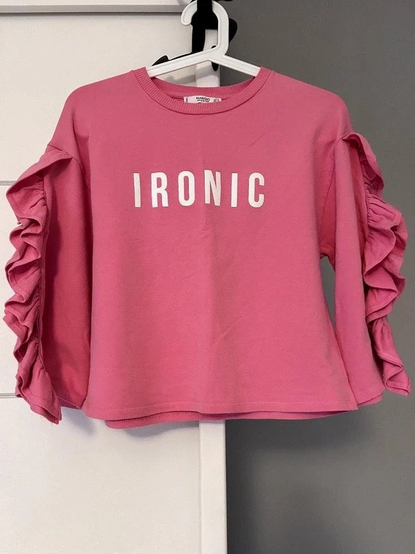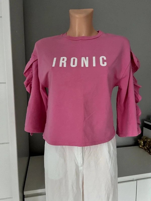 Bluzka bawełna 97 %, elastan 3 %, firmy Mango. Kolor różowy, napis Ironic, falbanki na rękawach.