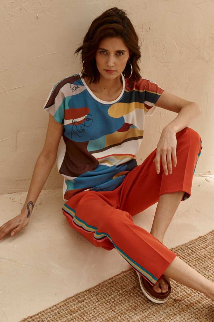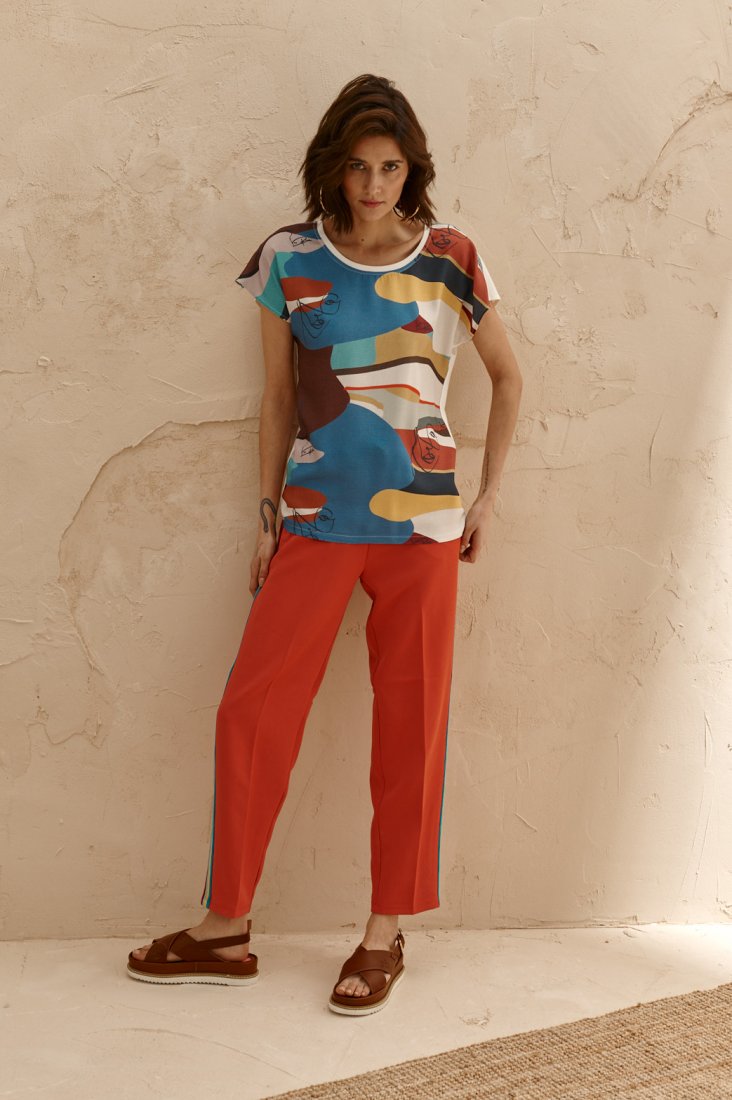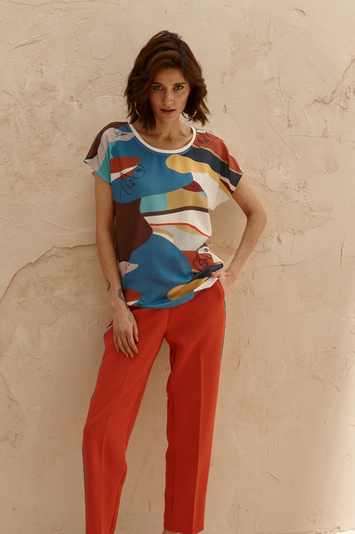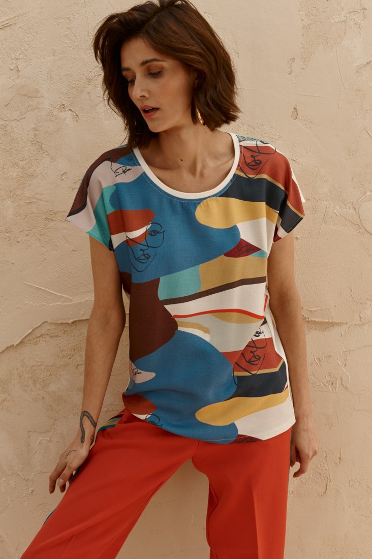 Bluzka - koszulka Begonia z dzianinowymi plecami i tkaninowym przodem. Tkanina z autorskim drukiem. Bluzka w kształcie kimona, z krótkim rękawem. Szyja wykończona pliską.