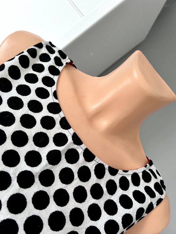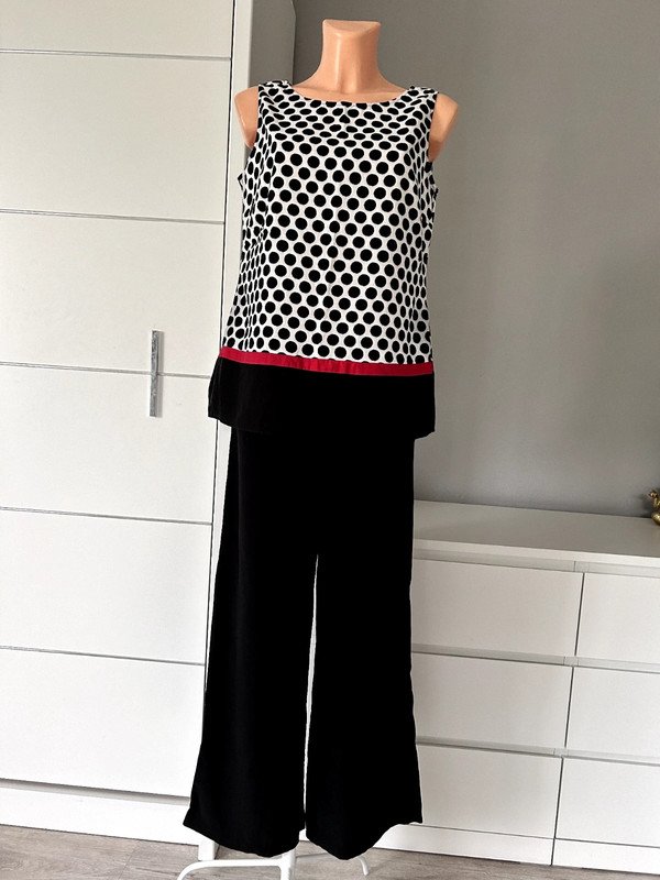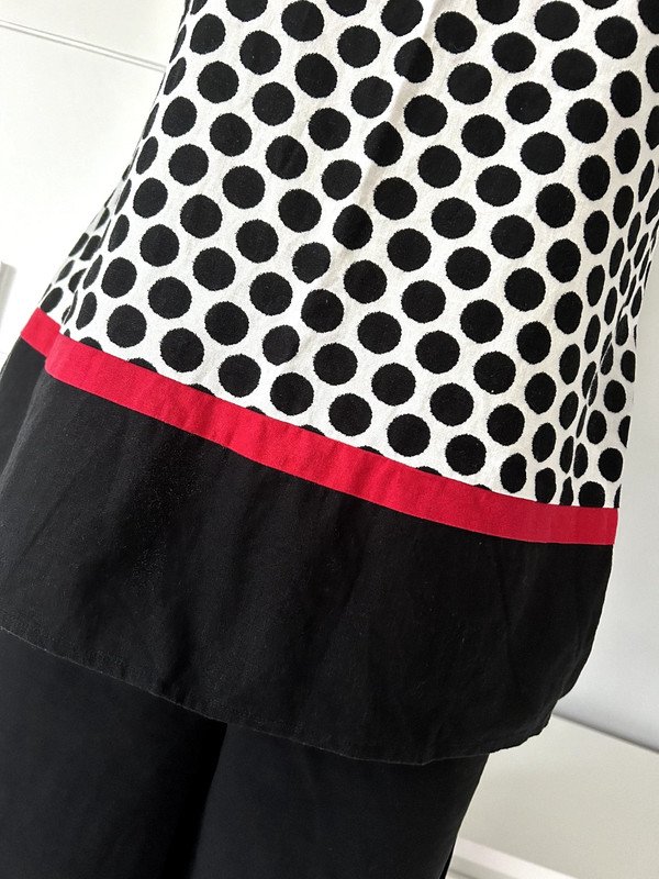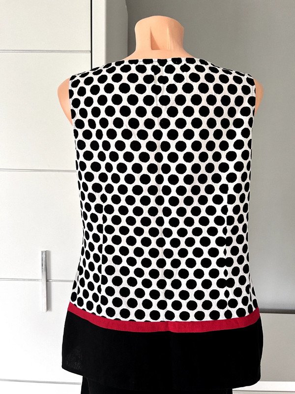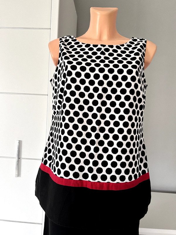 Bluzka firmy Marks & Spencer, rozmiar XL 42. Super skład 55 % len, 45 % wiskoza, a więc przewiewna. Klasyczny krój trapezowy z dekoltem w łódkę. Ciekawy print czarne kropki na białym tle, na dole czarny pas, ozdobiony czerwonym akcentem w postaci cienkiego paseczka, retro, vintege w stylu Jacqueline Kennedy.