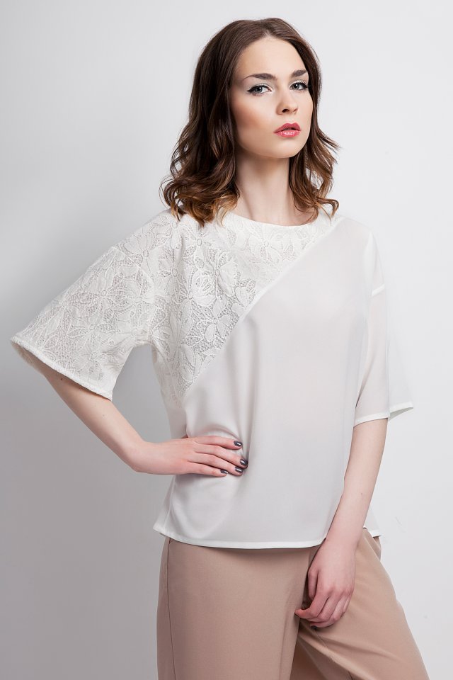Kimonowa bluzka o fasonie oversize, wykonana z kontrastowych materiałów. Świetnie sprawdza się w duecie ze spódnicami i spodniami, jako uzupełnienie formalnej i codziennej garderoby.