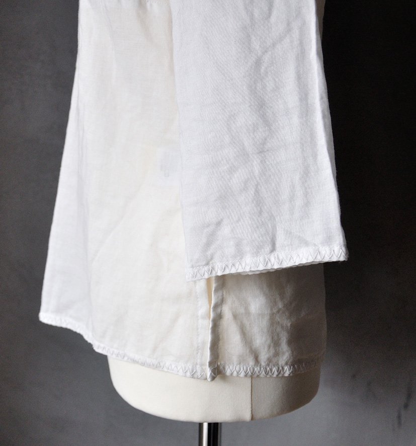Uszyta z cienkiej, sztywnej, nieco prześwitującej tkaniny o naturalnym, śmietankowym odcieniu.
