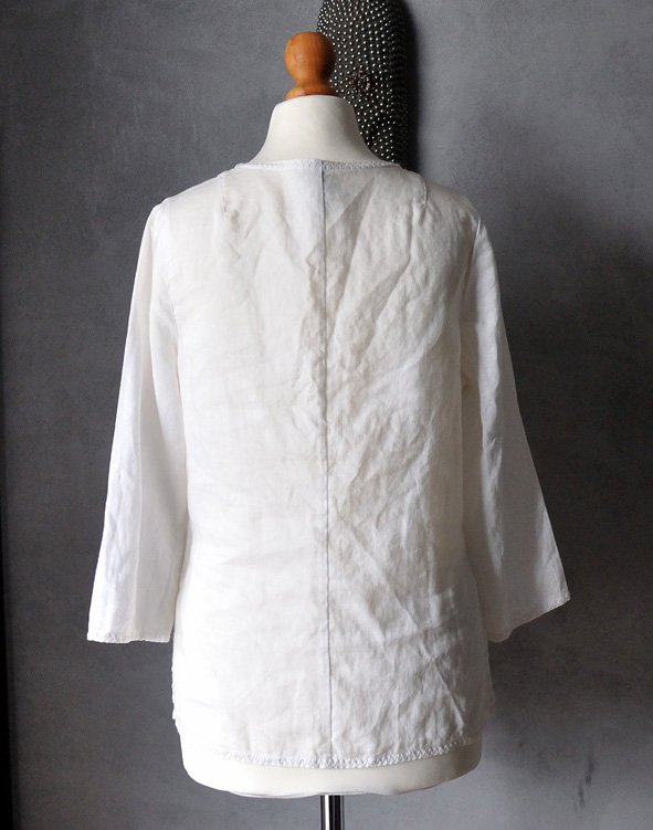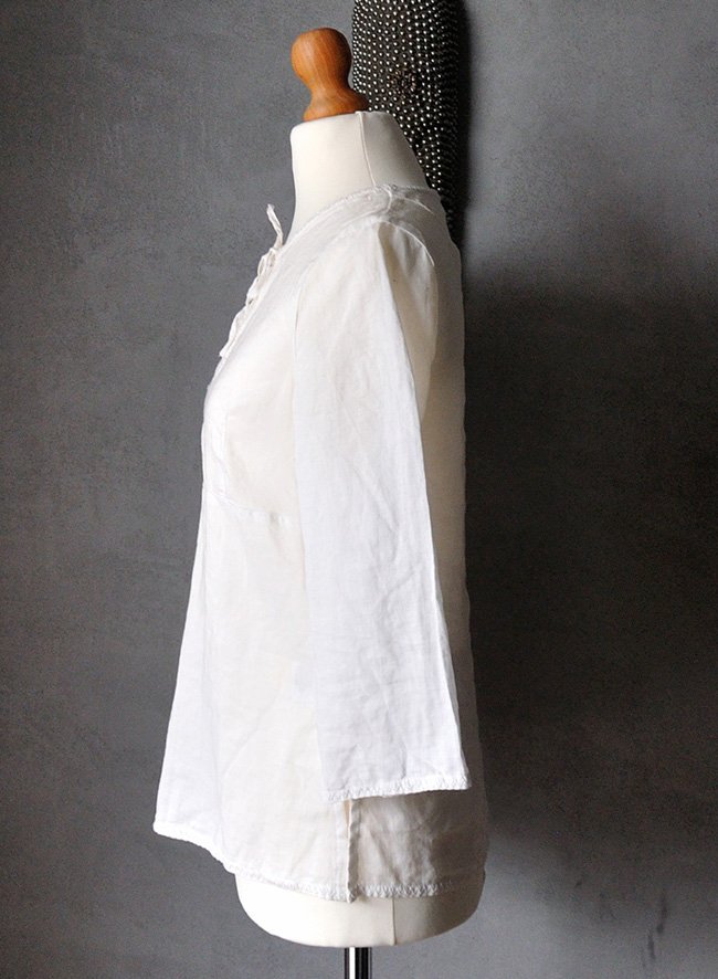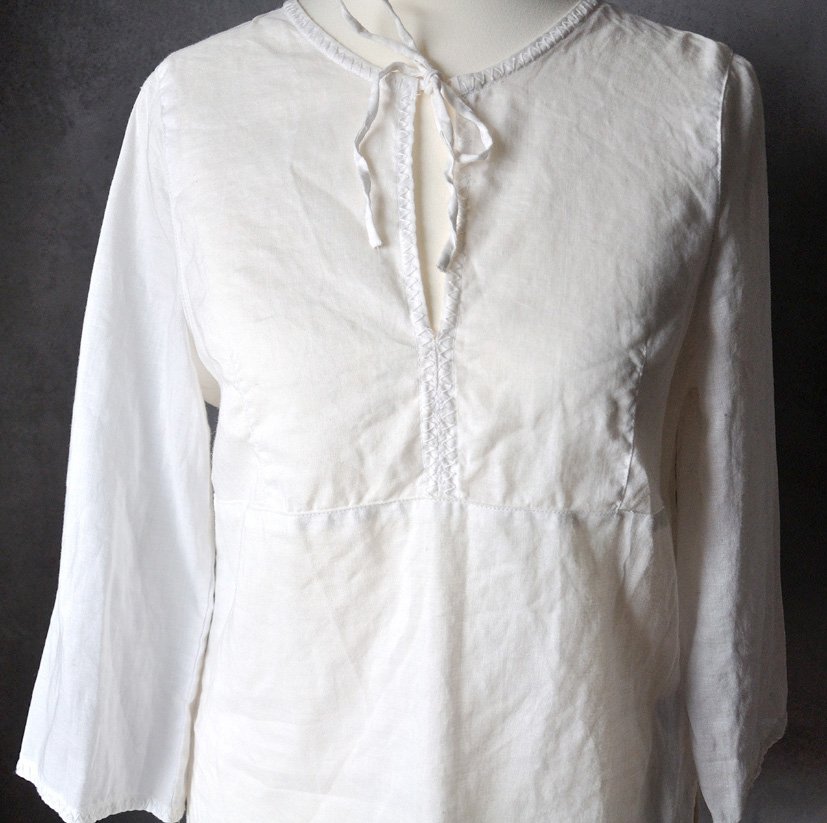Uszyta z cienkiej, sztywnej, nieco prześwitującej tkaniny o naturalnym, śmietankowym odcieniu.