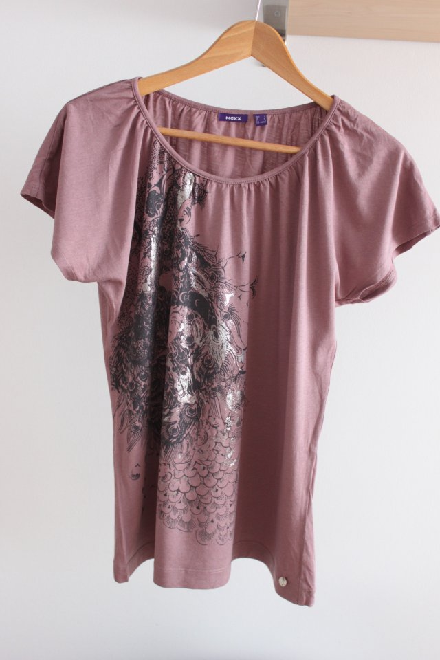 Bluzka w kolorze brudnego wrzosu z aplikacją w kolorach: grafit, srebro. Na metce rozmiar L. Szerokość bluzki mierzona pod biustem 50cm, długość 66cm. Materiał 50% bawełna, 50% wiskoza. Stan bardzo dobry.