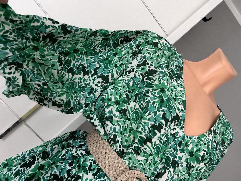 Bluzka firmy Cubus rozmiar XXL 44, wiskoza 100 %, a więc przewiewna. Dekolt v, gumka w pasie o przy rękawach. Kwiatowy wzór, kolor zielony, kremowy.