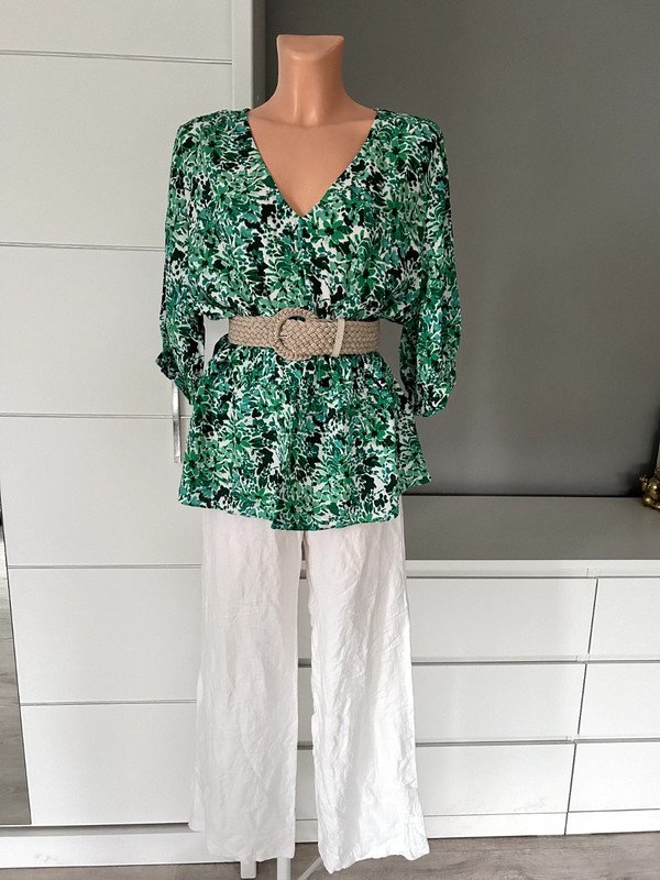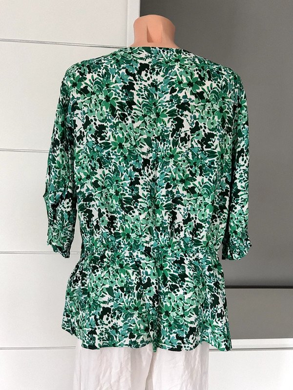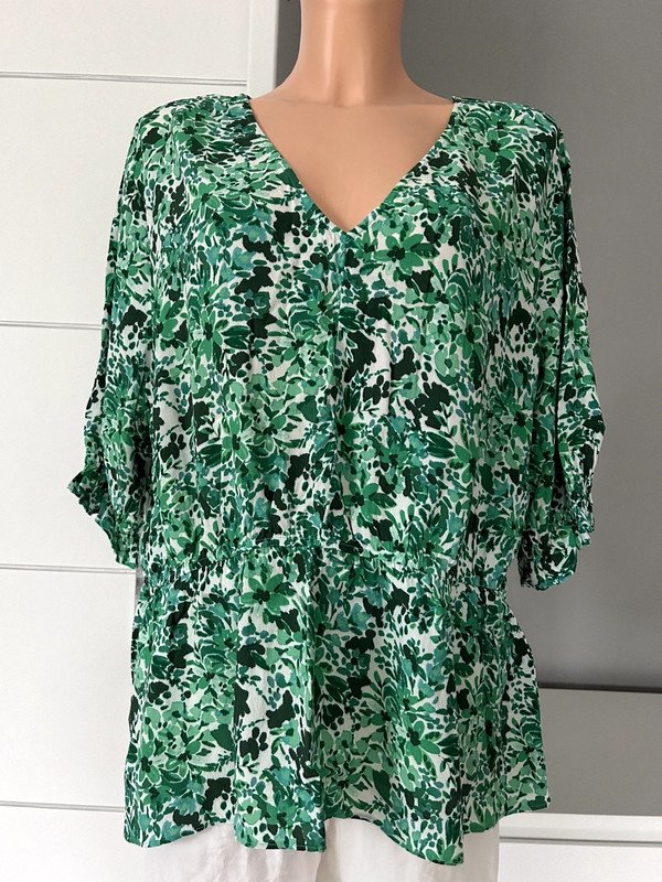 Bluzka firmy Cubus rozmiar XXL 44, wiskoza 100 %, a więc przewiewna. Dekolt v, gumka w pasie o przy rękawach. Kwiatowy wzór, kolor zielony, kremowy.